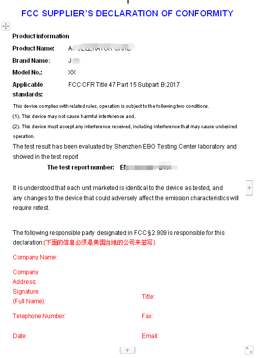 之前產(chǎn)品辦理FCC VOC或者是FCC DOC認(rèn)證的時候,都是測試報告+證書的。而更新到FCC SDOC之后,不再有證書,而是測試報告+FCC SDOC聲明文件。FCC SDOC聲明文件樣件如下: