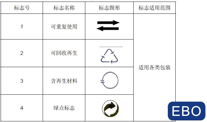 1. 該標準規(guī)定了四種標志,即:“可重復(fù)使用”標志、“可回收再生”標志、“含再生材料”標志和“綠點”標志,并定義了“綠點”標志術(shù)語(見表10.3)。四種標志的含義、圖形均與國際上使用的標志統(tǒng)一,有利于與國際接軌。