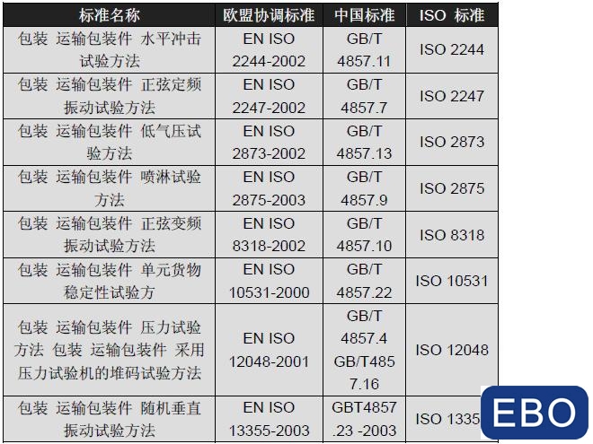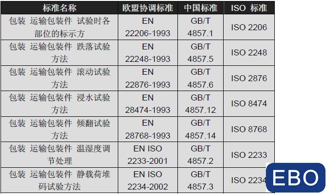表 中國和歐盟協(xié)調(diào)標準關(guān)于運輸包裝件試驗方法對照表