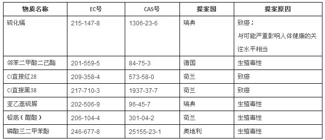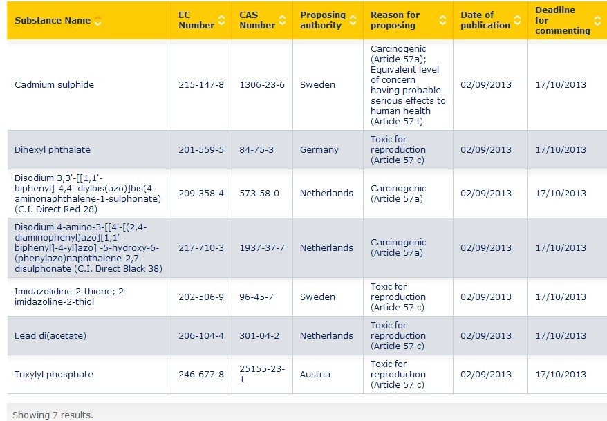 2013年9月2日,ECHA在其官網(wǎng)上發(fā)布了第十批七種擬列入SVHC清單的物質(zhì)進(jìn)行公眾咨詢,公眾意見截至日期為2013年10月17日。詳情如下表所示。
