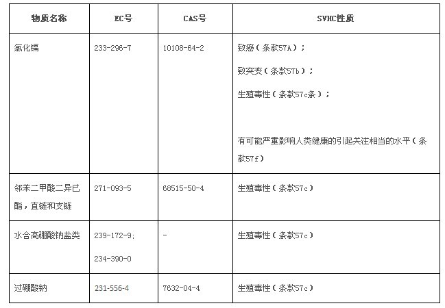 詳情可參考ECHA官網(wǎng): http://echa.europa.eu/view-article/-/journal_content/title/candidate-list-updated-with-four-new-svhcs