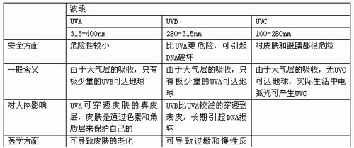 紫外線按照其輻射波長(zhǎng)的不同,可以劃分成紫外A(波長(zhǎng)為315?400nm)、紫外B(波長(zhǎng)為280?315),以及紫外C(波長(zhǎng)在280cm以下)三個(gè)波段。由于大氣臭氧層對(duì)紫外A的吸收很少,所以紫外A可以到達(dá)地面,其輻射量的變化基本上同臭氧層的變化沒有關(guān)系;而紫外C則同紫外A完全相反,它幾乎完全被臭氧層所吸收,所以它基本上不到達(dá)地面;而紫外B的輻射量同臭氧層的變化有著密切的關(guān)系,對(duì)人類也有較大的影響。紫外線的分布及對(duì)人體的影響可歸納如表1。